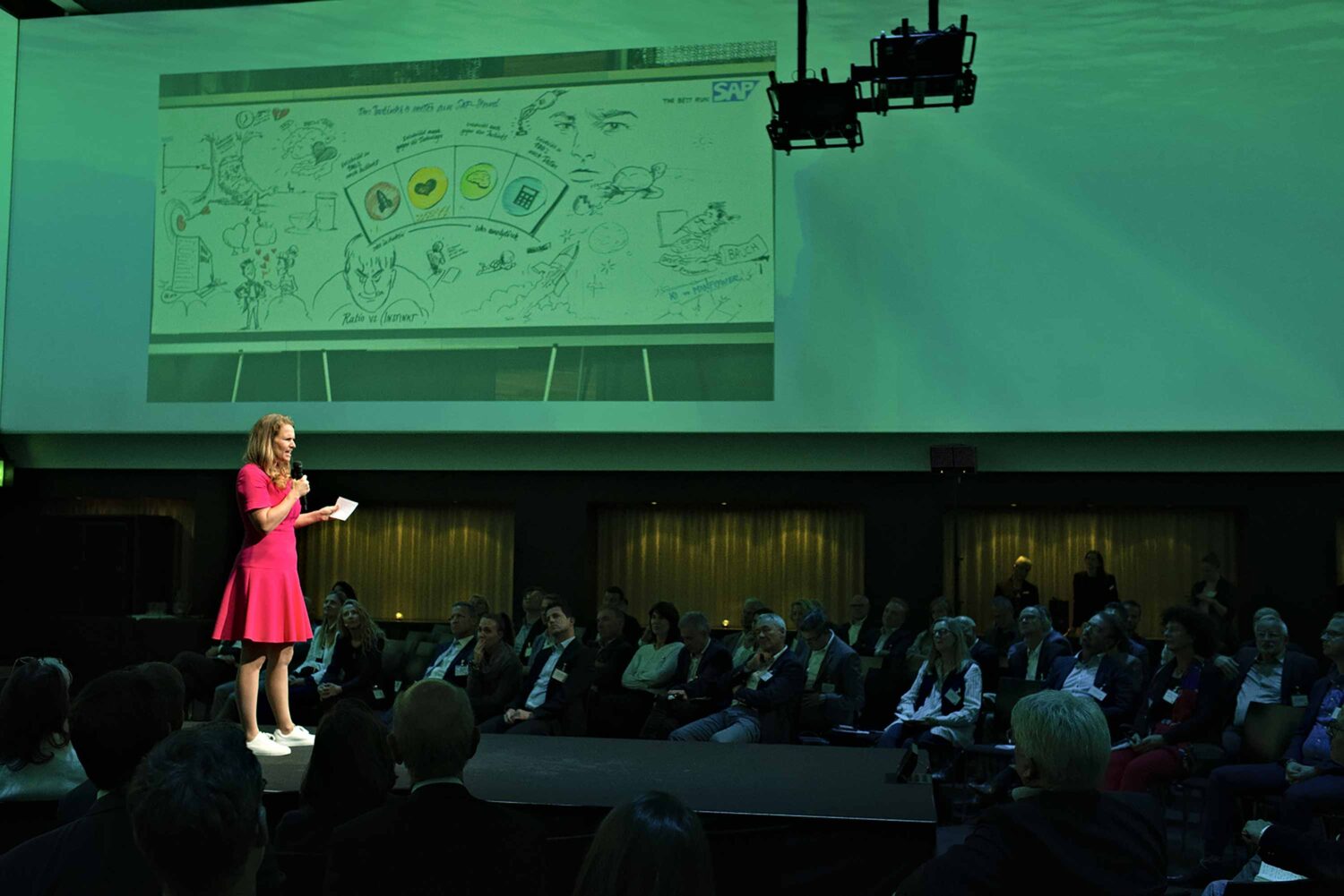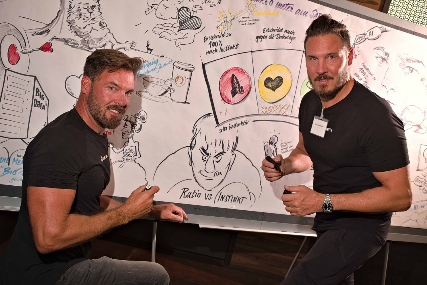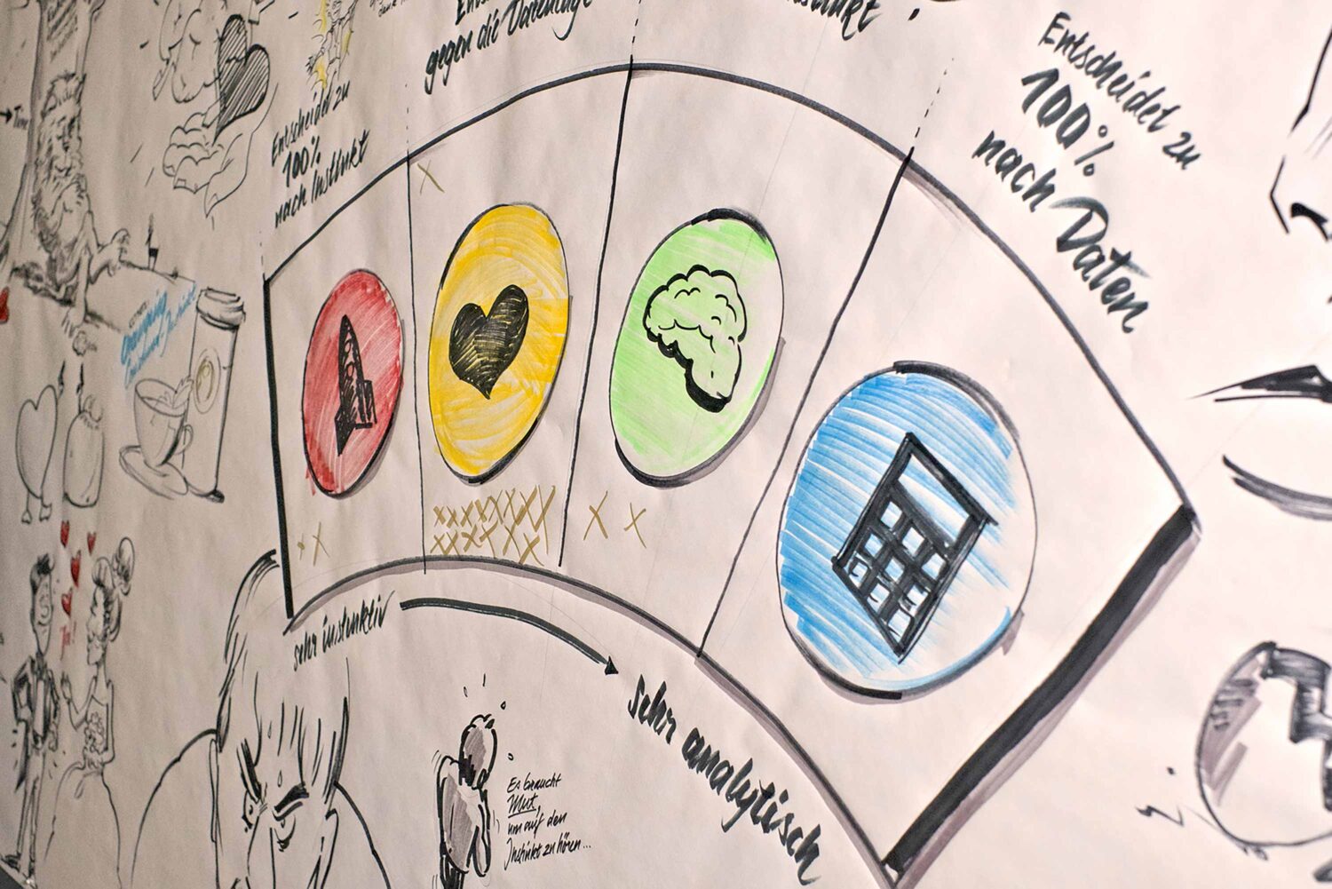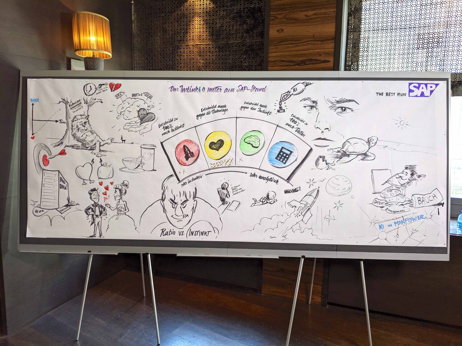 In den Pausen und Randzeiten führte Kathrin Hönegger für SAP mit interessierten Teilnehmern kurze Interviews zum Thema, während die Illustratoren Knut und Christian Eckert diese humorvoll porträtierten. Dabei wurden die Inhalte der Gespräche individuell eingearbeitet und der Instinkt-Typ farblich unterstrichen. Die Einzelporträts wurden im Anschluss an die Veranstaltung zusammen mit einer Dankeskarten an die Teilnehmer gesendet. Zum Schluss des Gesprächs wurden der Instinkt-Typ des Teilnehmers auf dem grossen «Instinkt-o-meter» Bild vermerkt. Rundherum wurde mit Impulsen aus den Referaten und Gesprächen aufgefüllt. So entstand über den Tag ein einzigartiges Stimmungsbild, welches gegen Ende auf der Bühne vorgestellt werden konnte und zeigte, dass die meisten Anwesenden als Typ «Herz» auch mal gegen die Datenlage entscheiden.
