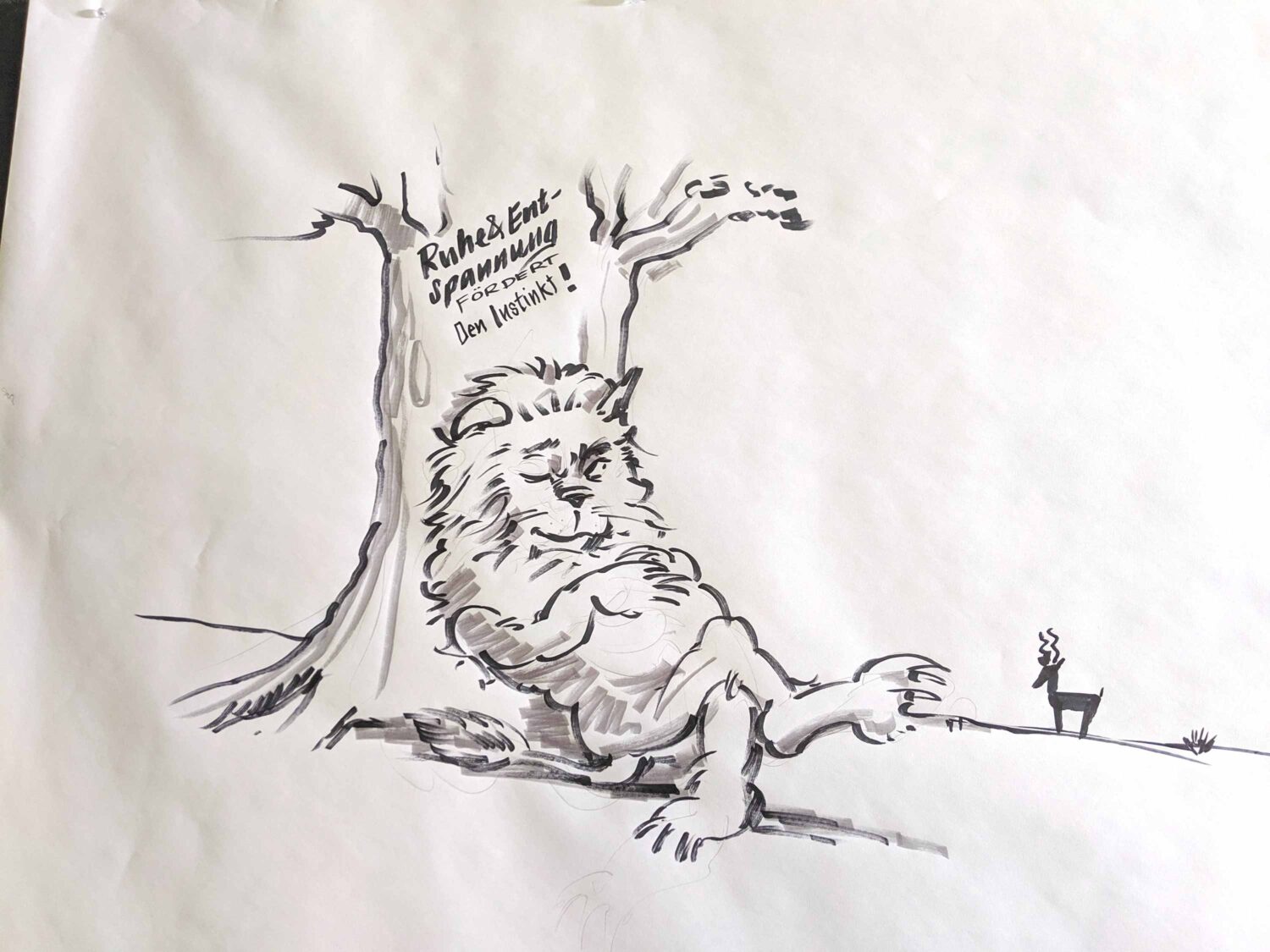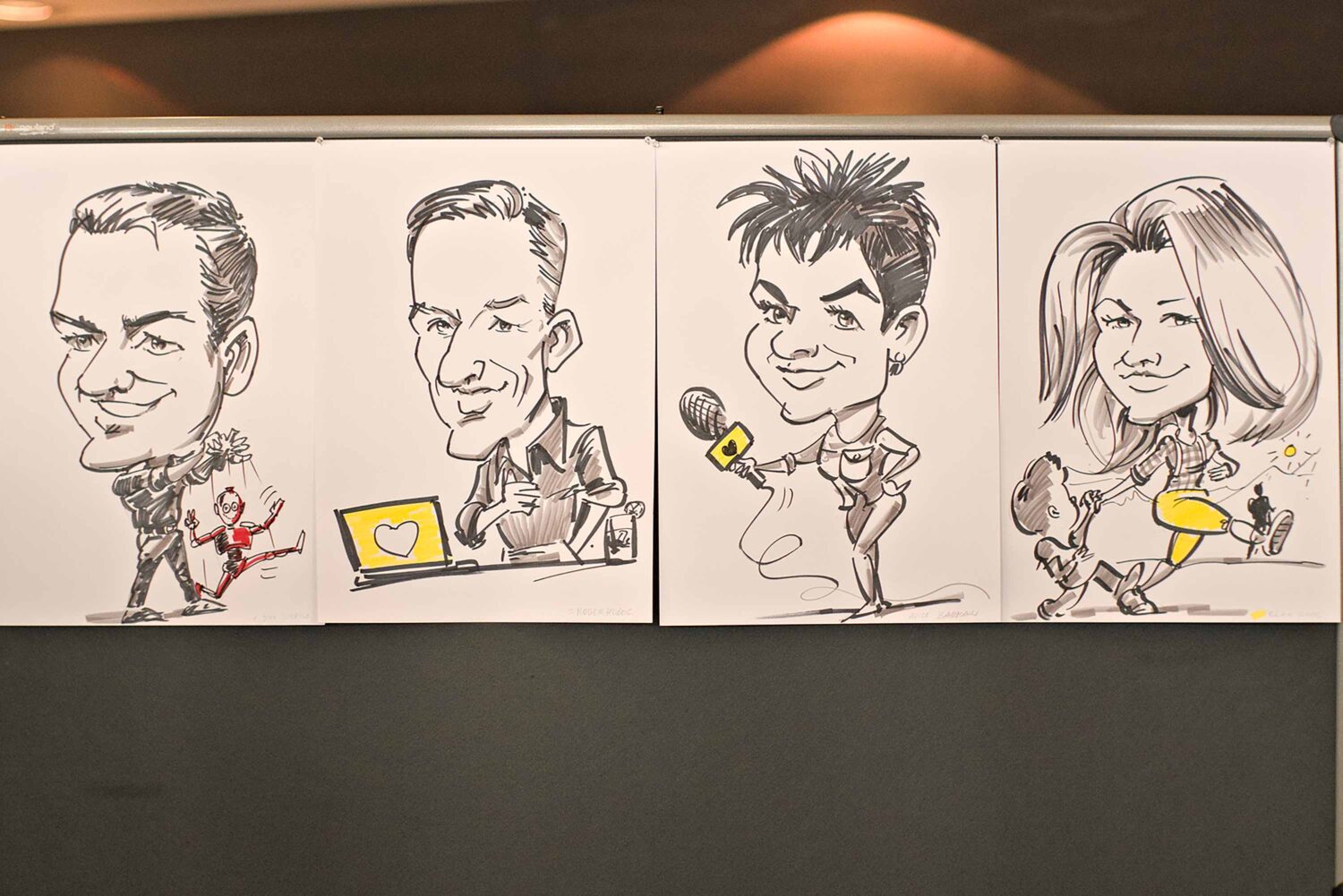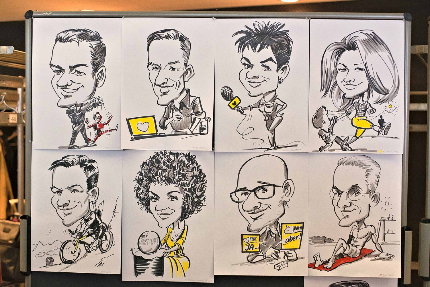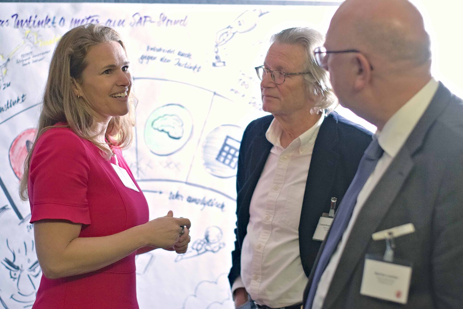 In den Pausen und Randzeiten führte Kathrin Hönegger für SAP mit interessierten Teilnehmern kurze Interviews zum Thema, während die Illustratoren Knut und Christian Eckert diese humorvoll porträtierten. Dabei wurden die Inhalte der Gespräche individuell eingearbeitet und der Instinkt-Typ farblich unterstrichen. Die Einzelporträts wurden im Anschluss an die Veranstaltung zusammen mit einer Dankeskarten an die Teilnehmer gesendet. Zum Schluss des Gesprächs wurden der Instinkt-Typ des Teilnehmers auf dem grossen «Instinkt-o-meter» Bild vermerkt. Rundherum wurde mit Impulsen aus den Referaten und Gesprächen aufgefüllt. So entstand über den Tag ein einzigartiges Stimmungsbild, welches gegen Ende auf der Bühne vorgestellt werden konnte und zeigte, dass die meisten Anwesenden als Typ «Herz» auch mal gegen die Datenlage entscheiden.